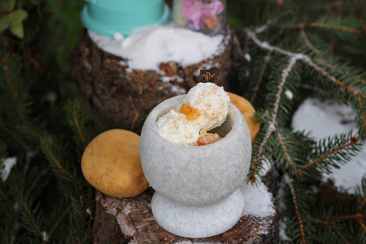La struttura del dolce nasce dalla patata di montagna, cotta lentamente e setacciata con cura per ottenere una cremosità naturale e discreta. La ricetta rinuncia ad addensanti e artifici, scegliendo la coerenza come cifra stilistica. Un tocco di sale alpino definisce il profilo aromatico e richiama i pascoli d’alta quota, mentre rafforza il legame con il territorio e ne amplifica la riconoscibilità .